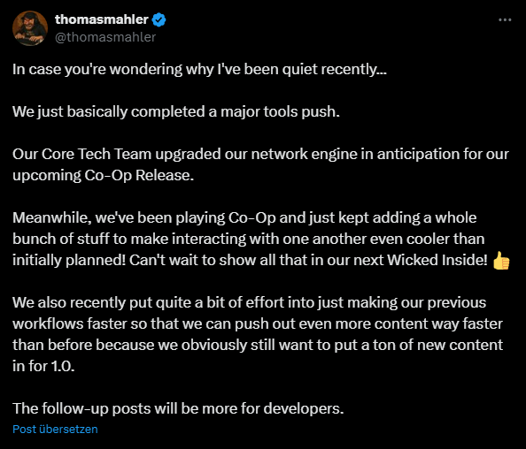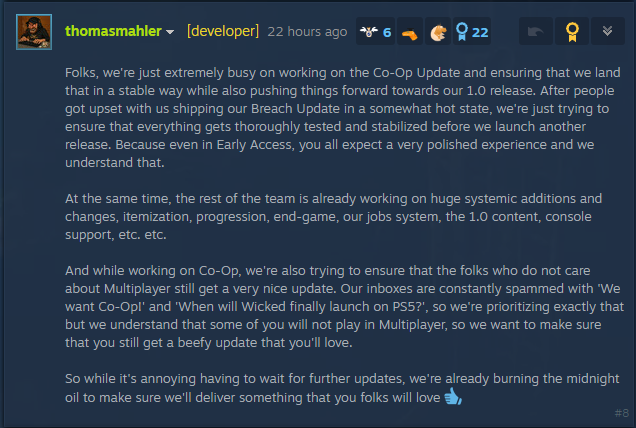 thomas said the planned updates coop/combat etc will come. and there wll be more updates after 1.0